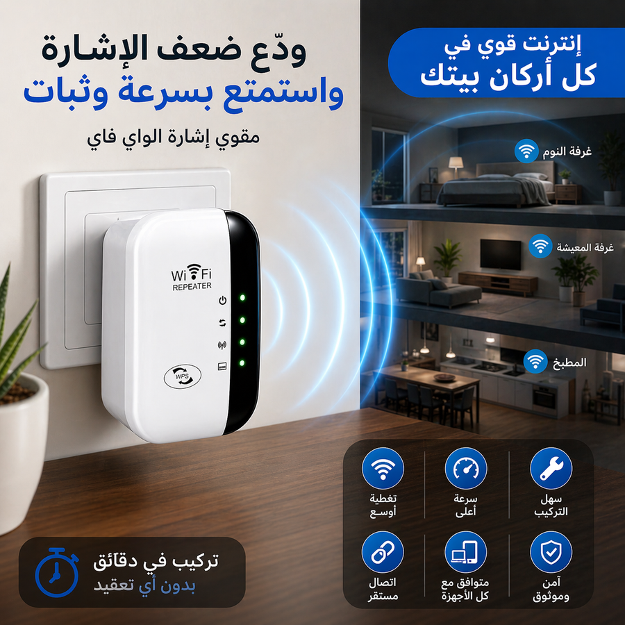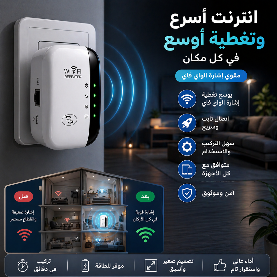 الحل عندك دلوقتي مع مقوي إشارة الواي فاي 300Mbps، جهاز عملي وبسيط بيقوي الشبكة ويوصل الإنترنت لكل حتة في البيت أو المكتب من غير وجع دماغ.